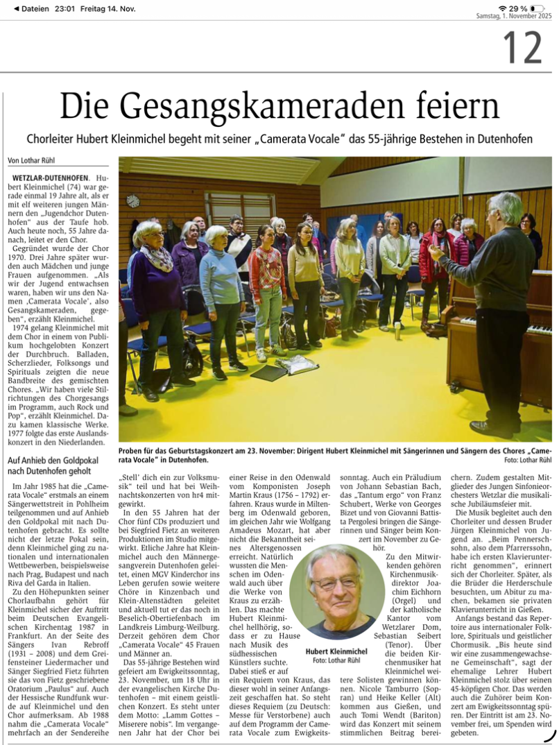 Der Dutenhofener Chor Camerata vocale unter Leitung von Hubert Kleinmichel hat das Jahr 2023 mit einem Konzert in der evangelischen Kirche beendet.